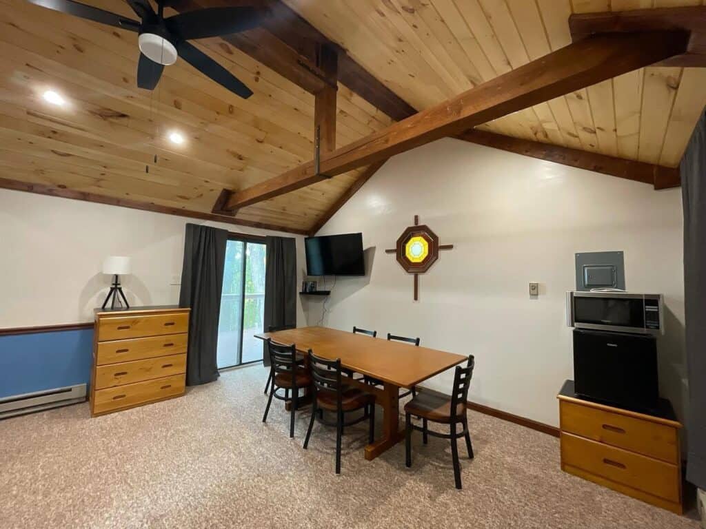 The Chaplain’s Cabin/Leaders Cabin offers more privacy for 1-2 persons with a full size bed, small table, and mini refrigerator.